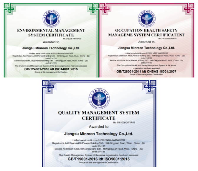 Recently, Jiangsu Minreon Technology Co.,Ltd. has passed the rigorous audit of national authority - China Quality Certification Center and obtained the certification of ISO9001 (Quality Management System), ISO14001 (Environmental Management System) and ISO18001 (Occupation Health Safety Management System), becoming one of the few domestic suppliers of 3D printing products and services that have obtained these certifications.