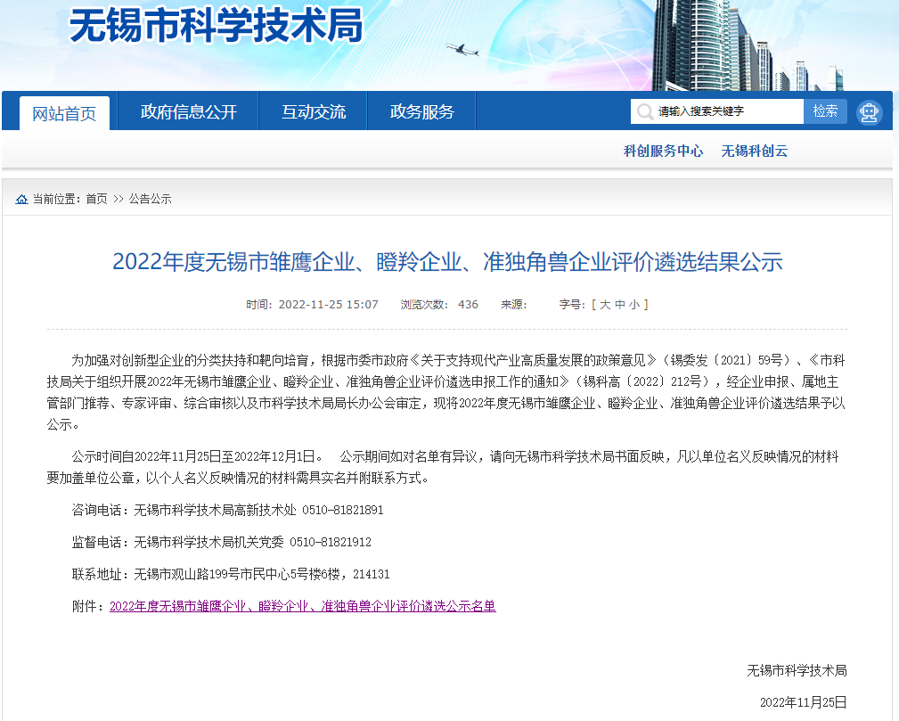 近日,无锡市科技局对2022年度无锡市雏鹰企业、瞪羚企业、准独角兽企业评价遴选结果予以公示。