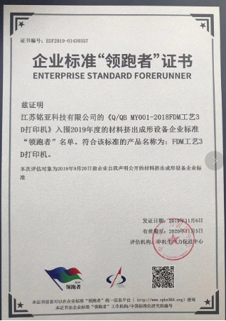 江苏铭亚科技有限公司以Q/QB MY001-2008《FDM工艺3D打印机》获评中国3D打印(增材制造)领域内首批企业标准“领跑者”,也表明了本公司的技术实力和产品质量获得国家的认可,更好的为客户服务。
